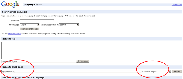 Google has a set of translation tools that will work quite well for this task. Visit Google's language tools site at http://www.google.com/language_tools?hl=en. In the "translate a website" section, enter the web site address for El Canasto, http://canasto.es/ and select the option to translate Spanish to English.