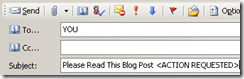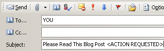 I'm a big fan of using the e-mail Subject Line to define my expectations of the recipient. It's a quick and easy way to let the reader know up-front what you will require of them. I call this the action statement. I enclose the action statement in brackets and use all CAPS to set it apart from the Subject Line. For example; This is my Subject Line <ACTION STATEMENT>